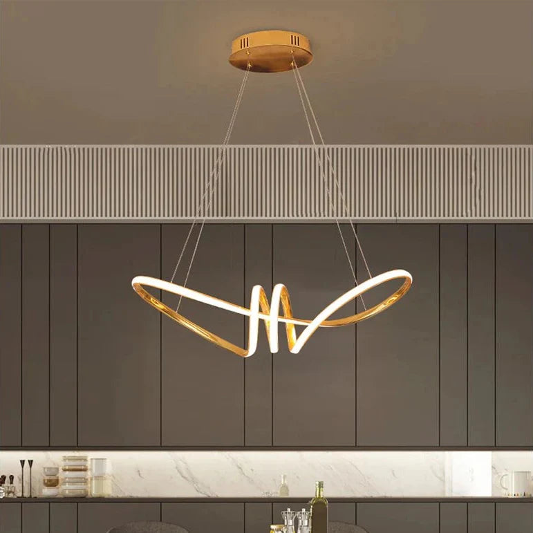 Eleve a estética do seu ambiente com o Lustre Pendente LED Infinito Dourado – 60W. Seu design escultural em forma de nó traz sofisticação e fluidez ao espaço, enquanto o acabamento dourado brilhante acrescenta um toque luxuoso e moderno.